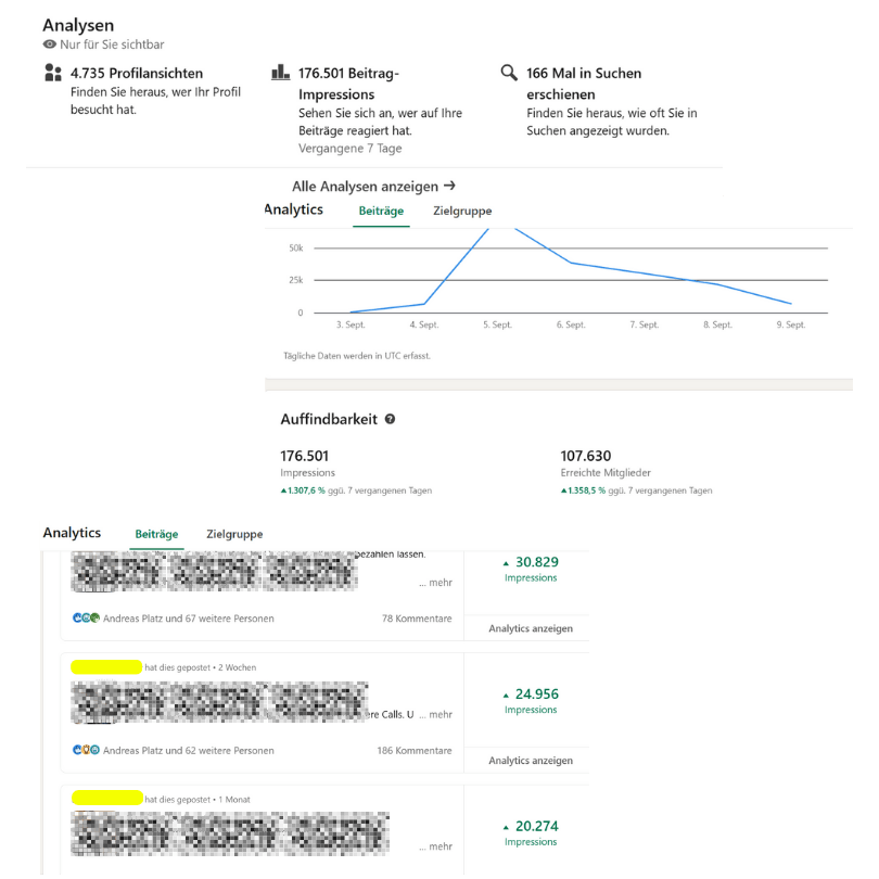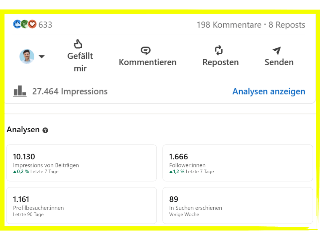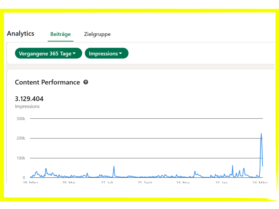 Ich muss an dieser Stelle mal eine 200% Empfehlung aussprechen. Und jeder der sehen möchte, wie erfolgreich Viki's LinkedIn Ding ist, der möge bitte mein Profil anschauen. 3 Millionen Impressionen im ersten Jahr. 4500 Follower. Jede Menge Austausch und Spaß!